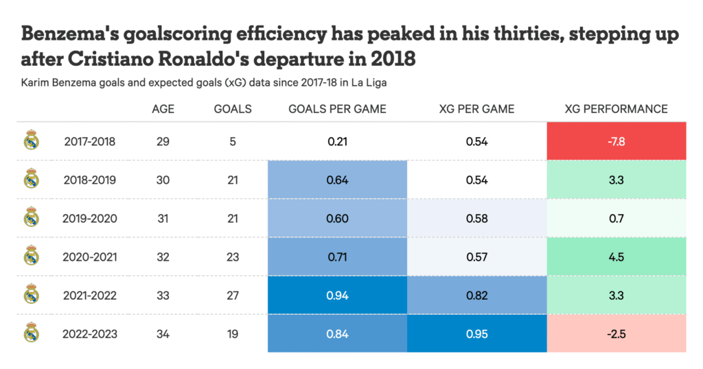 A valódi fordulópont 2018-ban következett be Cristiano Ronaldo távozásával. A támadósor súlya Benzema vállára nehezedett, és ő élt a lehetőséggel. Gólaránya jelentősen emelkedett, játéka direktebbé vált, miközben megőrizte kreatív kvalitásait. Carlo Ancelotti 2021-es visszatérésekor egy fizikailag és mentálisan is csúcsformában lévő csatárt talált. A 2021–’22-es idényben Benzema 44 gólt szerzett 46 mérkőzésen, mesterhármassal búcsúztatta a Paris Saint-Germaint, majd döntő pillanatokban talált be a Manchester City ellen. A bajnoki cím és a Bajnokok Ligája-győzelem mellé 2022-ben Aranylabdát kapott karrierje csúcspontjaként.